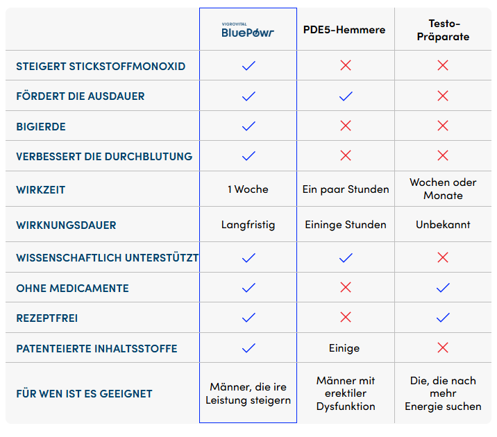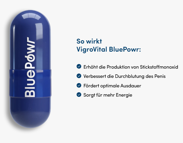 Wenn es um Leistungssteigerung geht, sind PDE5-Hemmer wie die kleine blaue Pille seit langem die schnelle Lösung. VigroVital BluePowr ist eine intelligentere und nachhaltigere Alternative, die das Problem nicht nur überdeckt, sondern ganzheitlich löst. Anstatt eine vorübergehende Wirkung zu erzwingen, wirkt es auf natürliche Weise mit Ihrem Körper zusammen, um eine ausgewogene, lang anhaltende Reaktion zu erzielen – ganz ohne Rezept. Warum sollten Sie sich also mit einer einmaligen Wirkung zufrieden geben, wenn Sie einen gleichmäßigen, dauerhaften Schub genießen können?